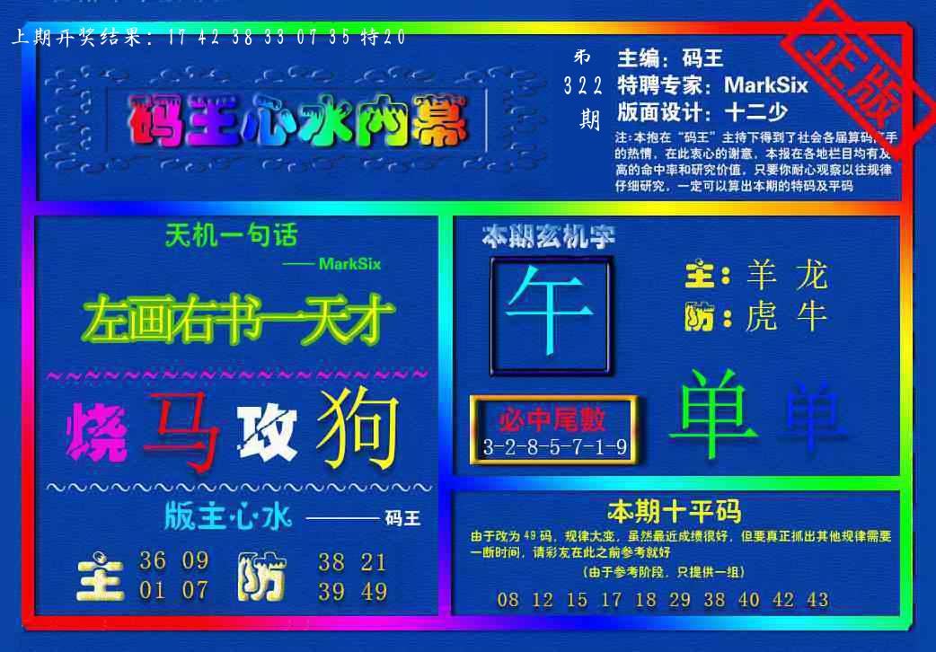 准确率高达90%,期期挑出12-18码 ____________★____________ 【九肖】 322期【猪龙蛇虎鸡狗马鼠猴】开????? 321期【猴羊狗牛鸡鼠蛇兔虎】开20狗对 320期【猪狗蛇猴马龙羊鸡牛】开30鼠错 319期【蛇鸡猴狗猪牛虎龙羊】开26龙对 318期【鸡虎鼠猴猪牛蛇龙羊】开43猪对 317期【虎鸡兔马猪猴羊牛龙】开18鼠错 316期【鸡猴羊兔牛鼠龙马狗】开44狗对 315期【兔虎羊猪马龙狗蛇鸡】开39兔对 ____________★____________ 【四头】 322期【4-2-1-0】开?????? 321期【3-1-0-2】开20狗对 320期【4-0-2-3】开30鼠对 319期【3-4-0-2】开26龙对 318期【0-4-3-1】开43猪对 317期【1-4-3-0】开18鼠对 316期【0-3-2-4】开44狗对 315期【3-0-4-2】开39兔对 ____________★____________ 【四行】 322期【金-木-水-土】开?????? 321期【金-木-土-火】开20狗对 320期【水-木-金-火】开30鼠对 319期【水-金-土-木】开26龙对 318期【土-火-木-金】开43猪错 317期【木-金-土-火】开18鼠对 316期【水-木-金-土】开44狗对 315期【木-火-金-土】开39兔对 ____________★____________ 【七尾】 322期【7-3-4-2-1-5-6】开????? 321期【9-2-5-0-1-4-8】开20狗对 320期【3-4-5-8-6-1-7】开30鼠错 319期【0-5-2-7-9-6-8】开26龙对 318期【7-2-4-0-1-3-8】开43猪对 317期【5-9-4-1-3-7-0】开18鼠错 316期【3-0-7-5-9-4-6】开44狗对 315期【1-6-7-5-2-3-9】开39兔对 ____________★____________ 【双波】 322期【蓝波+绿波】开????? 321期【红波+蓝波】开20狗对 320期【绿波+蓝波】开30鼠错 319期【绿波+红波】开26龙错 318期【蓝波+绿波】开43猪对 317期【蓝波+红波】开18鼠对 316期【红波+蓝波】开44狗错 315期【蓝波+绿波】开39兔对 ____________★____________ |
