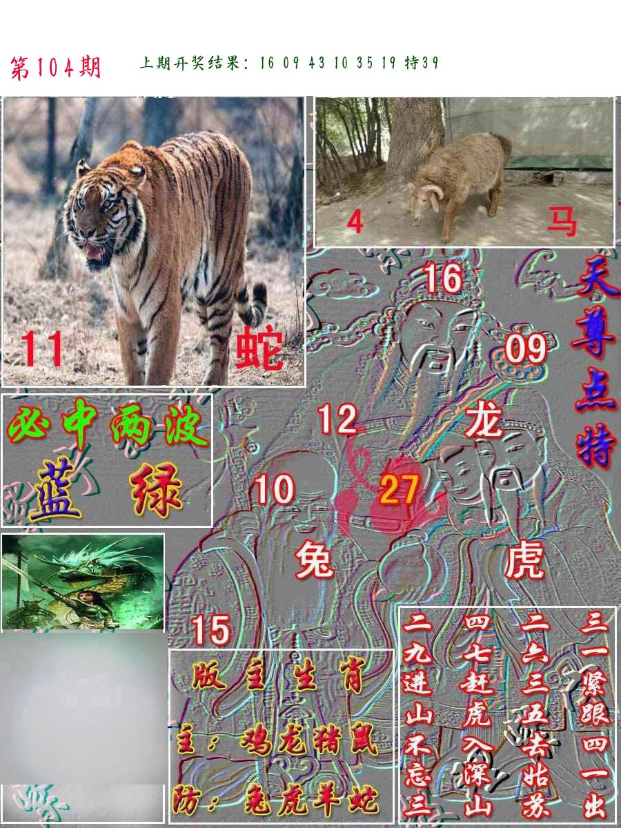 | 104期推荐五肖: 龙马虎羊蛇 ~~稳准狠 |